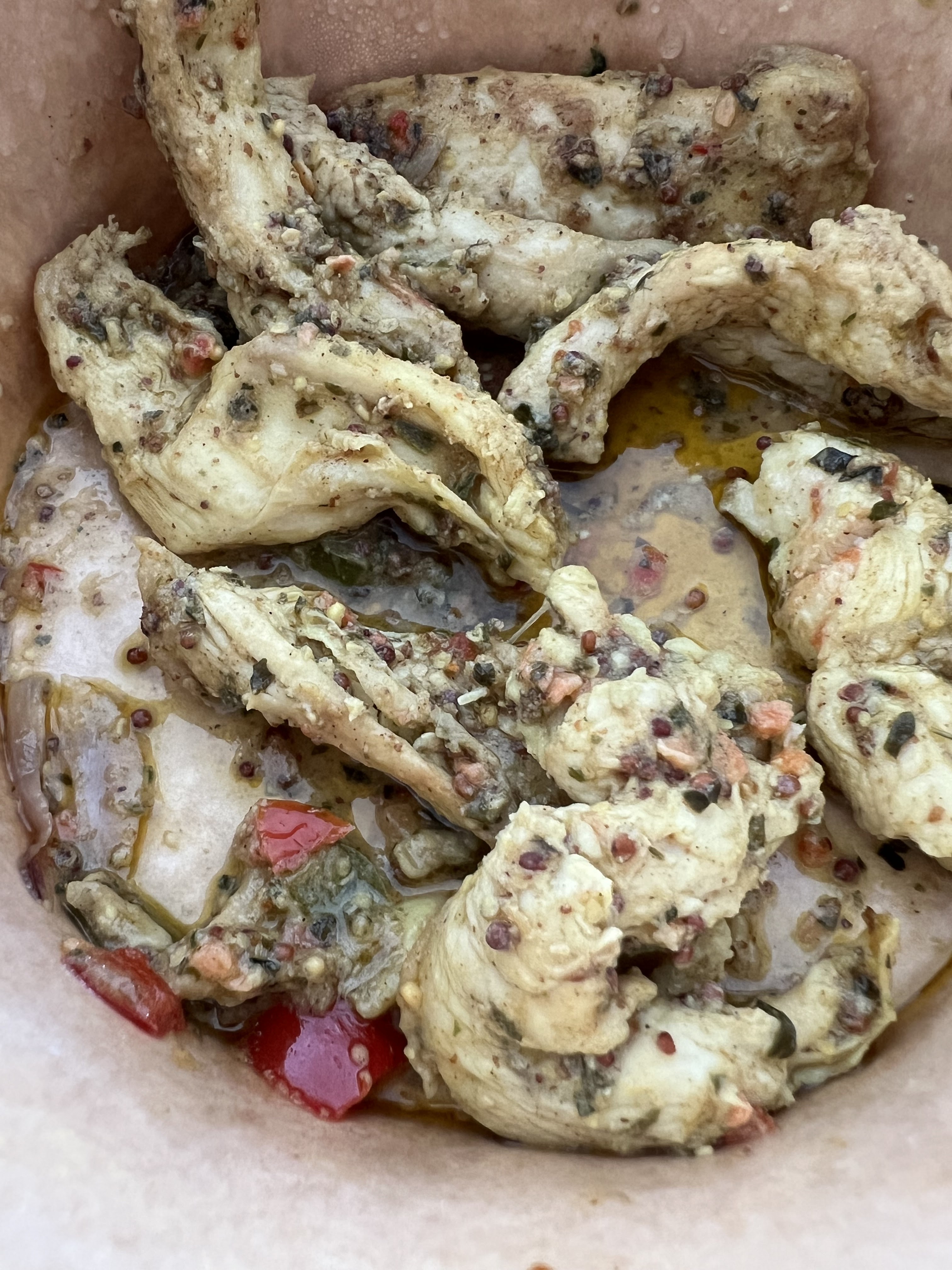 Commande passée par internet (livraison uber Eat). J’avais commandé 4 cuisses de poulet et une barquette de pomme de terre. A la place de 4 cuisses de poulet, j’ai eu : 2 petits pilons et 2 petits hauts de cuisses. Désolée mais je ne comprend pas qu’un pilon ou bien un haut de cuisse soit considéré comme une cuisse entière. De plus les pommes de terre étaient tellement épicées (sauce rouge) qu’on a pas pu les manger (et pourtant on aime manger épicé). Aussi ce serait bien de préciser que les enfants ne peuvent pas en manger (même si les adultes arrivent à avaler une bouchée). Repas du dimanche: 0 !