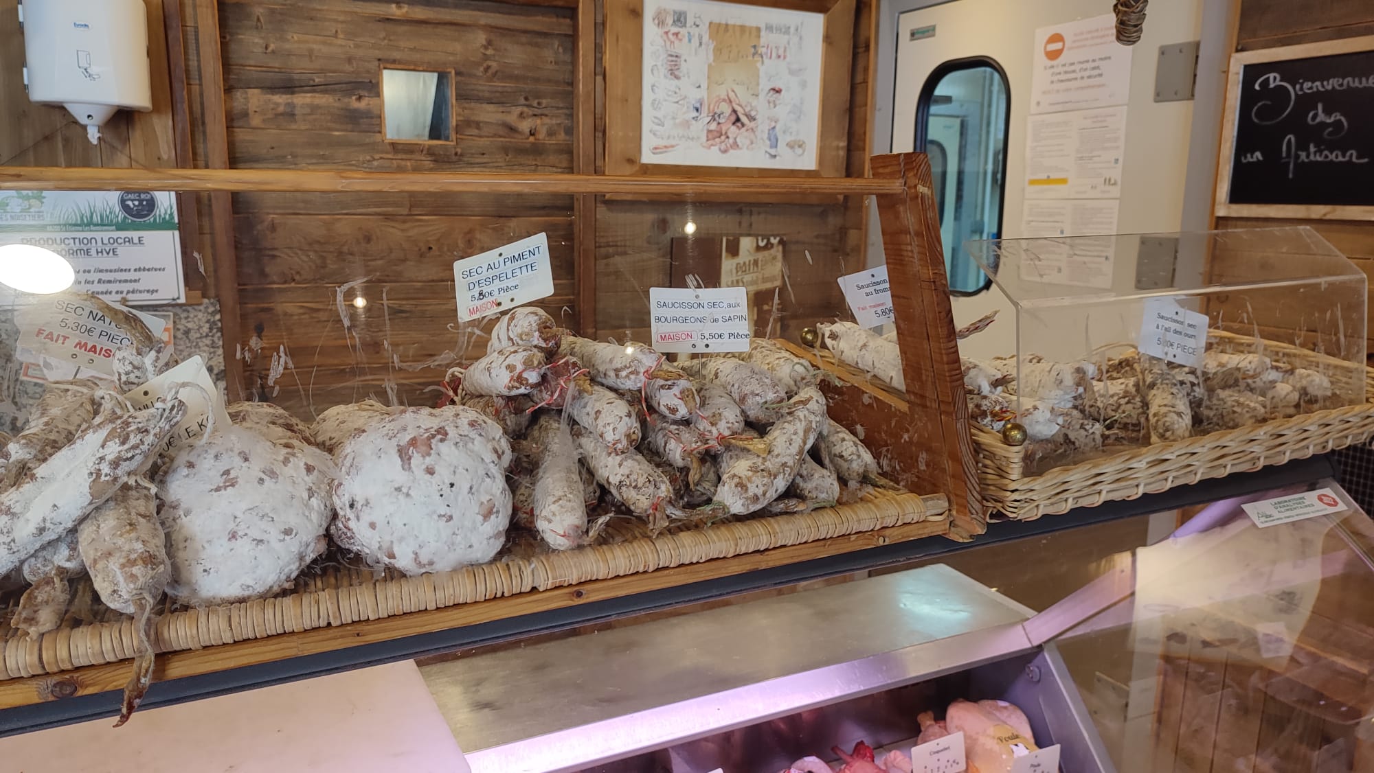 Concept original ! Boulangerie et boucherie traiteur à la fois.... vue dun côté sur le jeune boulanger qui enfourne ses pains et de l autre sur le fumoir avec les saucissons qui sèchent !!! Un pain au lard délicieux qui n a pas eu le temps d arriver jusqu 'au gîte 😊, des sandwichs sur demandes avec la charcuterie et le pain maison .