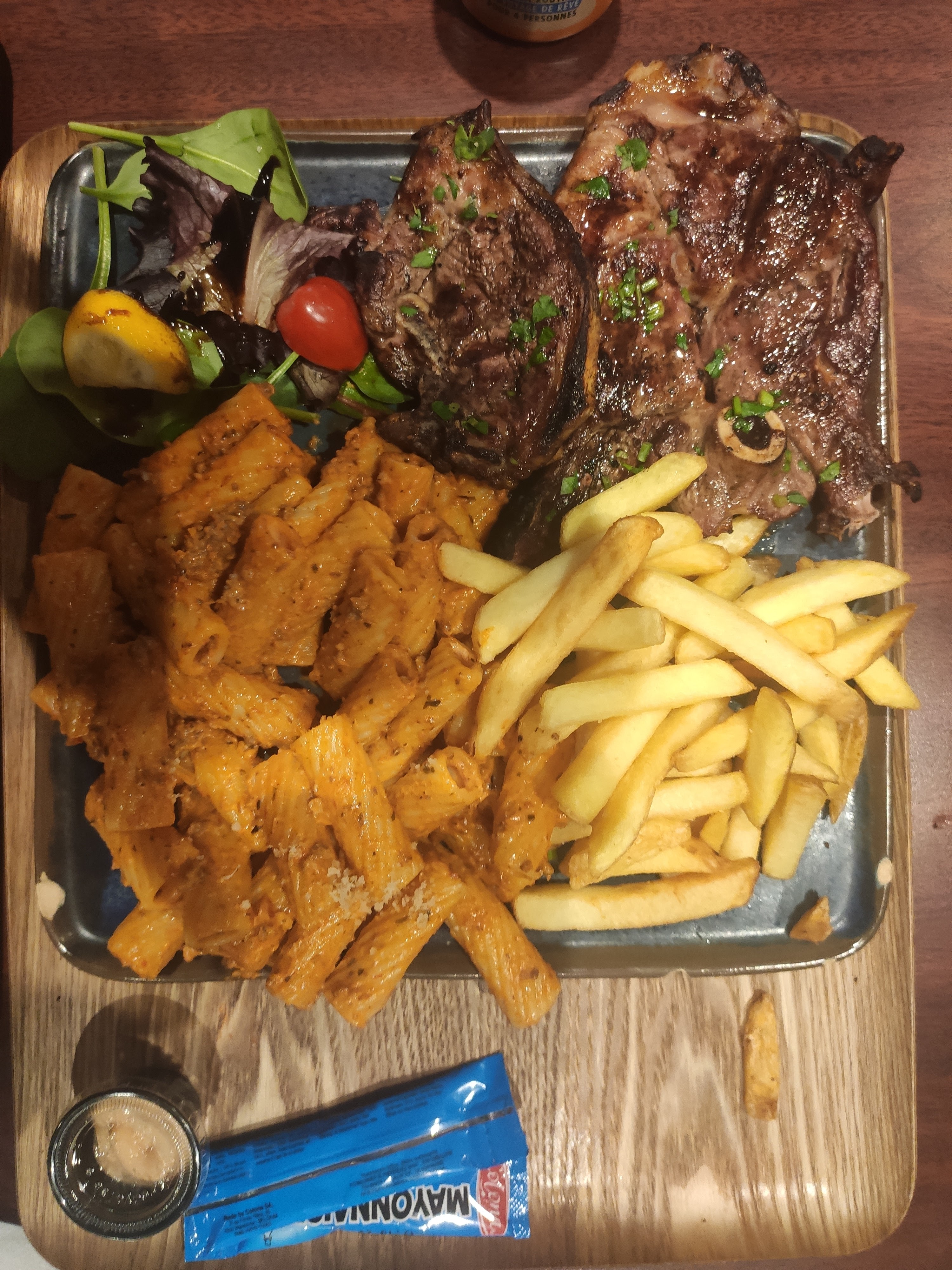 L'idée est bonne. La viande en elle-même est bonne, les aliments et la présentation aussi. Les portions trop petites à notre goût. Le point négatif est qu'il faut réclamer, manque 1 portion de frite, manque 1 sauce etc. Le service est à améliorer, l'organisation aussi. Je vous encourage.