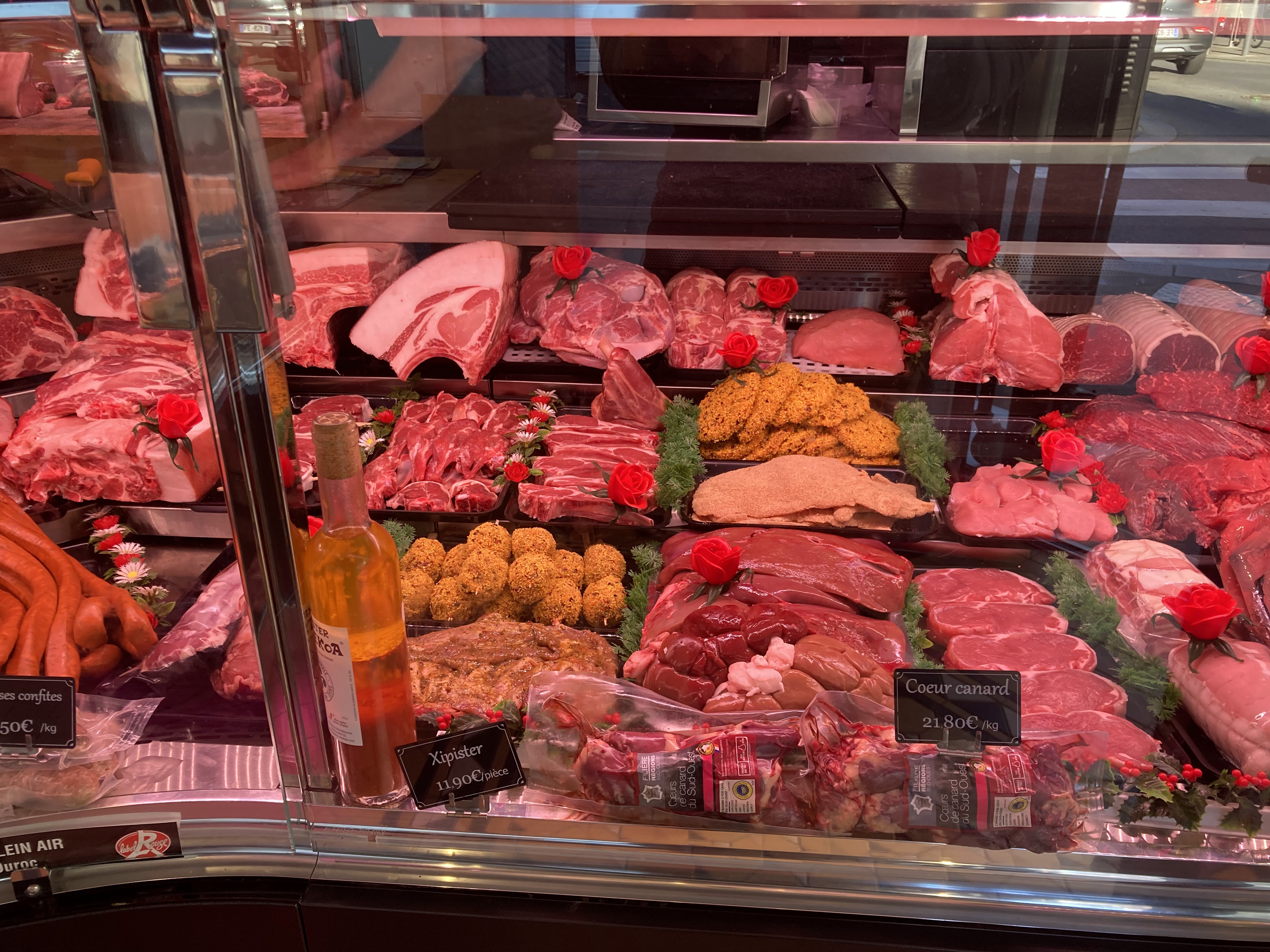 Un stop au hasard, nous étions en chemin vers un gâteau basque ( une tuerie…. chez Loubere !) vendu à quelques dizaines de mètres , et là, d’abord l’accueil souriant et sympathique des bouchers, ensuite une offre variée en boucherie et traiteur. Nous avons goûté les lasagnes, les épinards, les carottes râpées, le céleri rémoulade, les œufs en gelée, mais quel régal !!!! Et la viande….. une jolie entrecôte, dont on pourrait manger le gras tellement il avait du goût ! Nous y reviendrons avec plaisir.