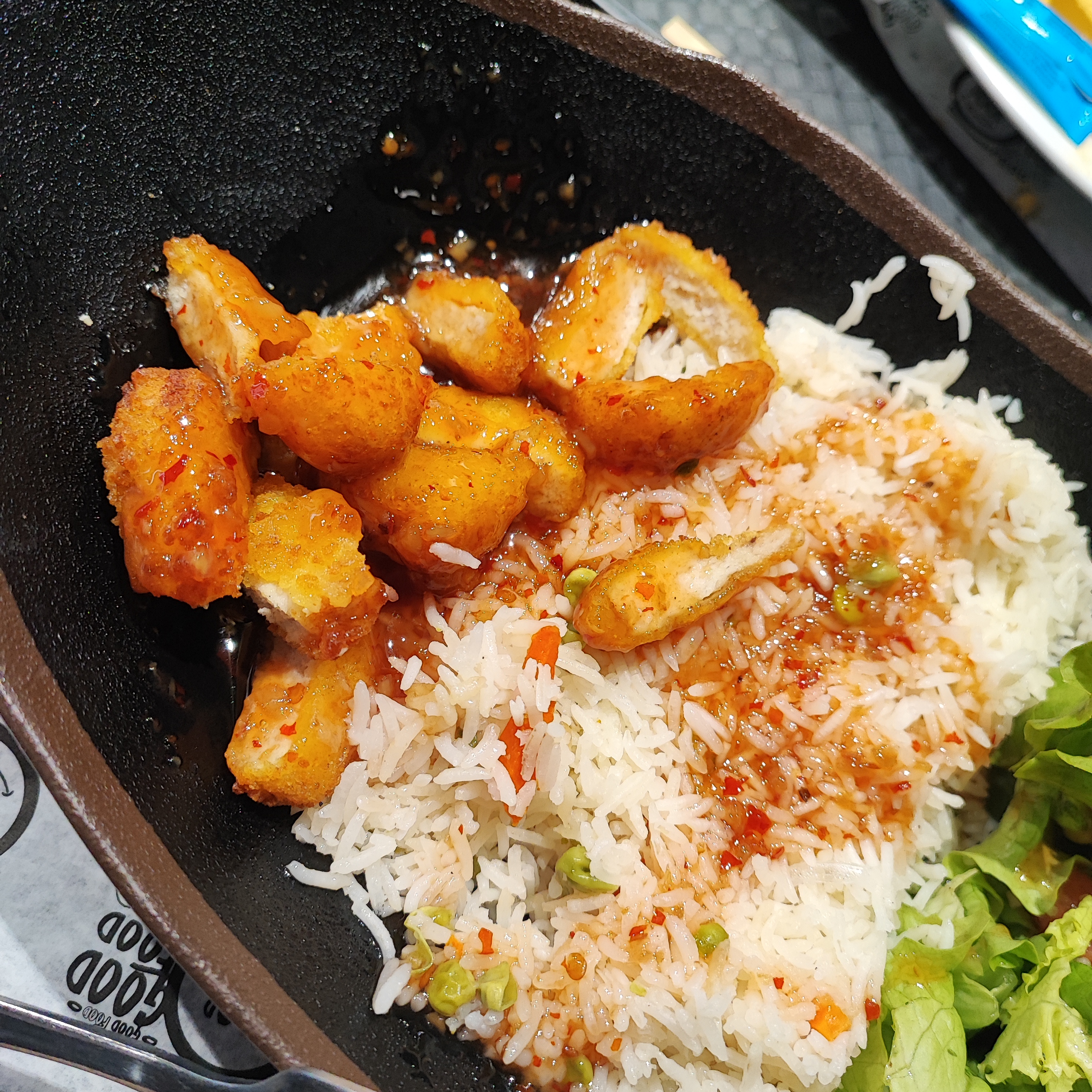 Bonjour plat pris aujourd'hui mais pour ma part ce n'est pas un Riz Katsu, C'est une escalope milanaise avec de la sauce chili. Pour ma décevant et très loin d'un vrai riz Katsu. Il aurait été préférable d'avoir une vraie escalope panée sachant que la matière est présente. Dommage