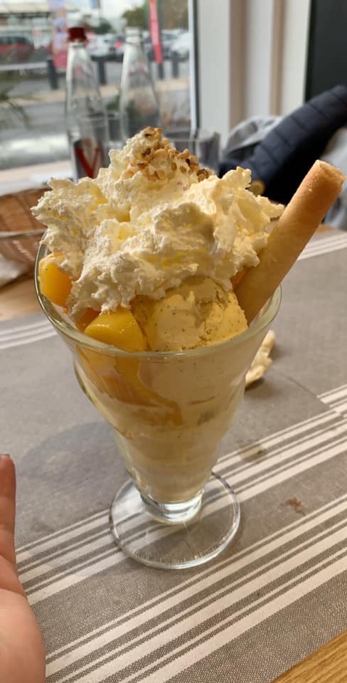 Je n'ai pas eu la chance de goûter aux plats, je suis arrivé à 15h le service du midi était terminé, mais le patron m'a proposé de prendre un dessert, et j'ai pas été déçu, 3.90€ la glace pêche melba géante fait maison. Bon courage pour la finir à une personne ! C'est certifié AVS également